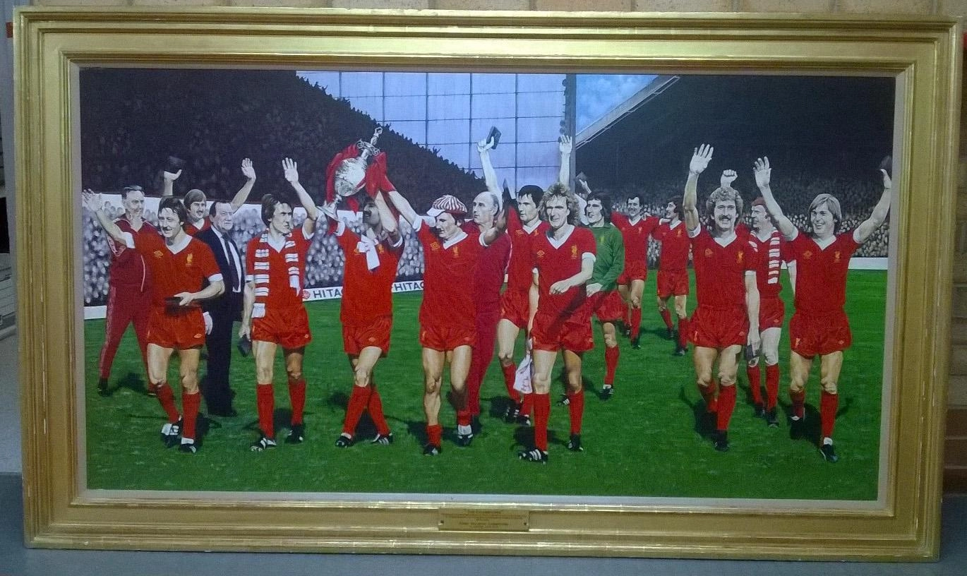 It is the work of renowned artist Roger Harvey and was commissioned by the club's then-sponsors Hitachi to commemorate Liverpool's 12th Football League championship success in 1979-80.