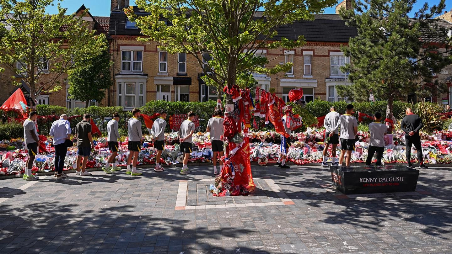The Reds gathered at the poignant memorial site that has formed outside the stadium in honour of Diogo and Andre, who tragically died in a road traffic accident in Spain last Thursday.