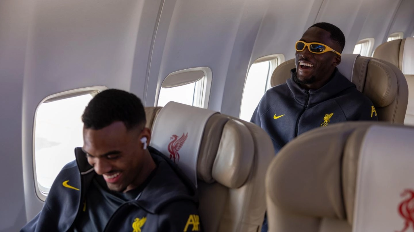 4pm, Paris: Soon after we arrive at our hotel, word reaches us that Arne Slot and his squad are at John Lennon Airport ahead of the team flight out to Paris. That means we’re able to publish news of the 24-man travelling squad selected by the head coach. Ibrahima Konate’s choice of sunglasses are getting a lot of attention from his teammates, while Mohamed Salah passes some time by playfully throwing a pillow at Dominik Szoboszlai in the row in front. “What a landing, pilot!” exclaims Konate, as the aircraft touches down in his home city.